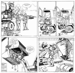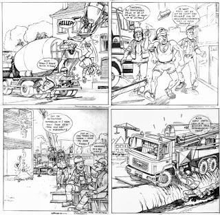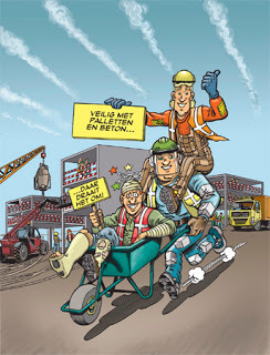 De covertekening van het stripboek rond Pol Pallet en Benny Beton, dat vrijdag in Brussel zal voorgesteld worden. Het boek zal zowel Nederlandstalig als Franstalig zijn en een heleboel schetsen en making-of materiaal bevatten, naast de uiteindelijke gekleurde platen, zoals die verschenen zijn in het driemaandelijks informatieblad voor welzijn en milieu in de bouwsector van Navb-Cnac Constructiv.