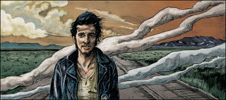 Opnieuw geen gemakkelijke prent om te tekenen. Aanvankelijk wilde ik Bruce ten voeten uit tekenen, in het midden van een desolate highway. Maar dan had ik hem zo klein moeten schetsen dat hij haast onherkenbaar was. Deze tekening heb ik gedeeltelijk gebaseerd op een foto uit een begeleidend boekje bij "Tracks", gecombineerd met het lederen vest dat hij droeg bij de fotosessie voor "Born to run". Het desolate landschap heb ik vrij geïnterpreteerd naar een foto uit het boek dat bij "The Promise" zat. De kleuren heb ik wat irreëel gemaakt. Blauwe lucht vond ik te hier te banaal.