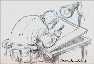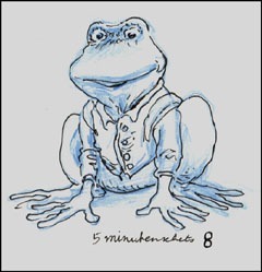 Ook volgende twee schetsen werden elk op vijf minuten tijd gemaakt. Een noeste tekenaar aan een krakkemikkige tekenplank, geen zelfportret, en een kikker met een kolbertje aan (in het Vlaams "gillet")