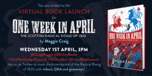 Hooray! After nearly two years of research, visiting the relevant sites and writing, One Week in April: The Scottish Radical Rising of 1820 will be launched tomorrow. This will be a virtual launch and everyone’s invited.