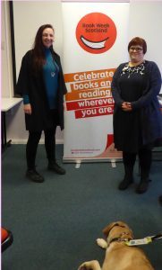 Then I travelled south to the Forth Valley Sensory Centre in Camelon, Falkirk, to speak to a visually-impaired reading group. This group holds monthly sessions for anyone who enjoys audio books, whether they are visually impaired or not. The picture below shows Vikki Ring (on the right) and Lynne James (on the left) of Falkirk Libraries, with Rosie the guide dog settling herself down for a snooze. Lynne is the person to get in touch with for anyone interested in joining the audio book group, although it’s so popular there’s currently a waiting list.