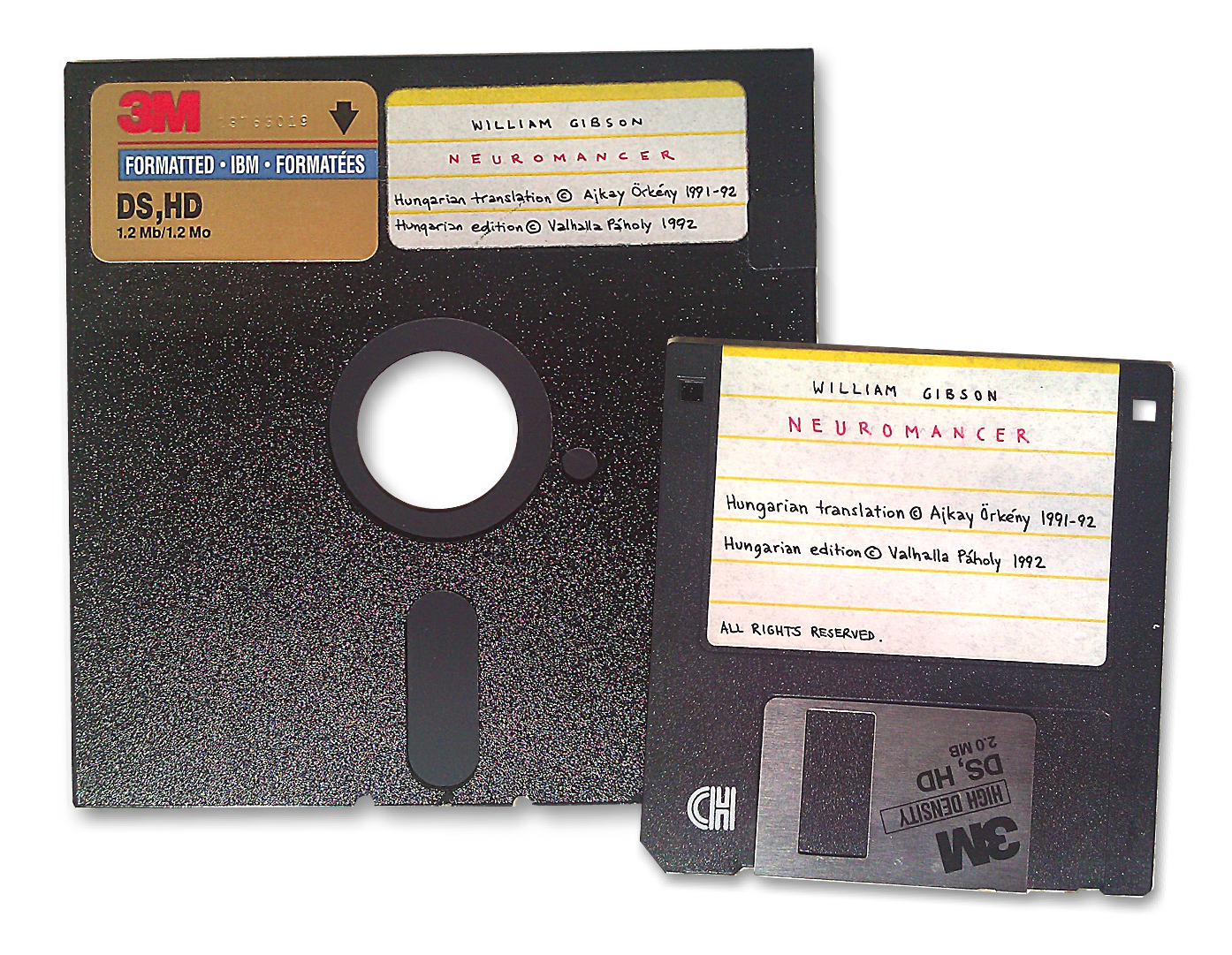 Végezetül íme egy fotó egy igazi ereklyéről, amit személyesen Ajkay Örkénytől kaptam, és nem más látható rajta, mint a Neurománc első fordítása floppylemezeken: