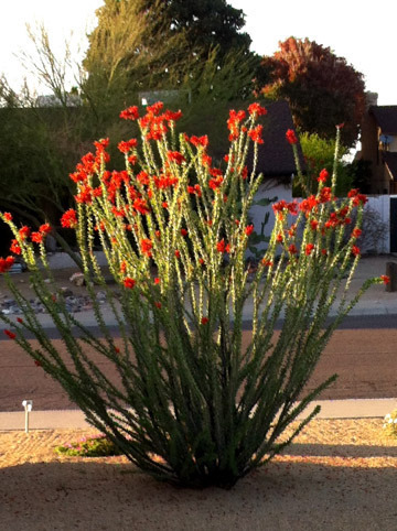 There's a time of year in the Sonoran Desert when plant life is perfect. That time is now. We have a few hot days and a bit of rain, and the Ocotillo, which looks like a collection of thorns and sticks, breaks out in leaves and flowers.