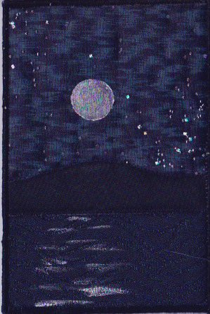 The postcard is a black-on-black postcard that this scan doesn't do justice. It's at least four black fabrics–a sky, which is a sheer over another layer, a mountain and a lake–all quilted. The different depths of the blacks, the sparkling stars, the painted moon and reflection–it was all beautiful.