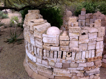 Castle wall made entirely out of handmade, minimally-decorated building bricks. What makes it effective is the cumulative effect of bricks. The installation is at the Desert Botanical Garden in Phoenix.