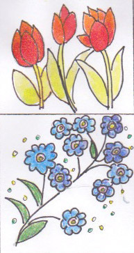 Flowers done in drawing class, tulips done in Sharpie glitter and Twinkling H20s