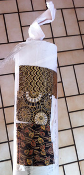 3. Storing papers is hard. I have a lot of papers that are large and need to be rolled and stored in mailing tubes. In order to roll them, you need a core, and I use parchment paper, scrunched up. You can see it in the photo, looking like a firecracker fuse. In order to remember what I have in each tube, I cut a piece of each kind of paper and tape it to the outside of the tube. In the one shown, all the paper as washi that have gold in them. I have another one for double-sided mulberry papers. Again, whatever system works for you. It's the only way you'll find anything.