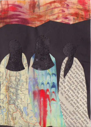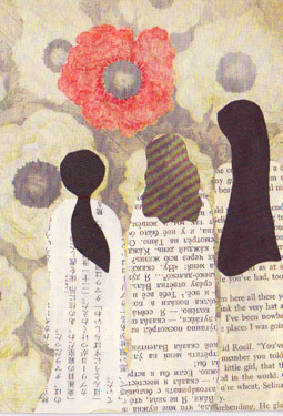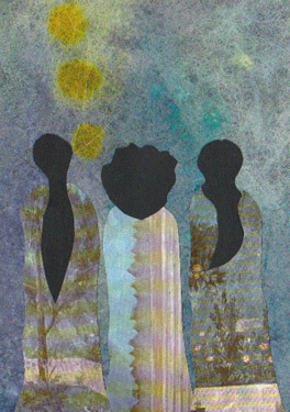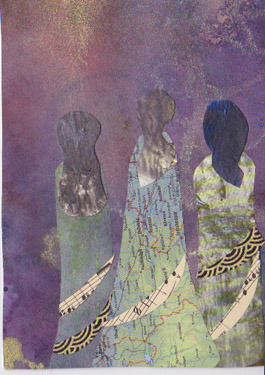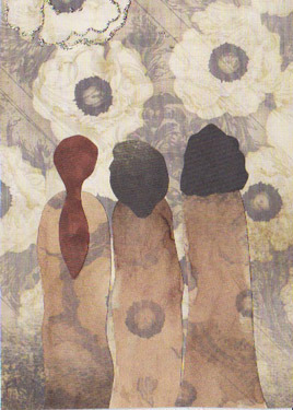 From there, I realized that if a woman is a regular woman, not a gifted spirit, she doesn't become powerful, she becomes invisible in our culture. Around age 45, women become discounted if they don't keep their figure, look younger, more appealing. So I made three women who are looking at a dazzling sight (the outline of glitter on the poppy doesn't show in the scan), but fading from view. You can see through them.