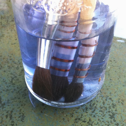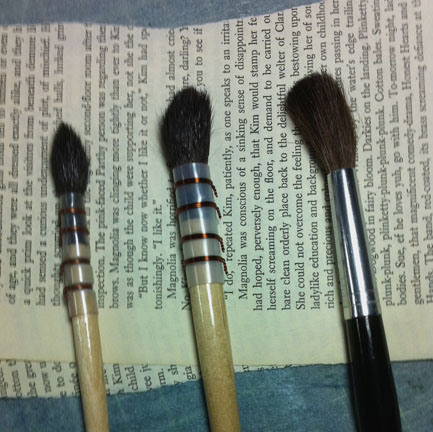 I put all three brushes into water. (I tinted the water blue to make it show up on the photo.) You'll notice I didn't just drop them into a jar. Natural-hair brushes shouldn't be left point down to soak. It ruins the point. And once a natural-hair brush has a bent tip, it's ruined. Wet, the two larger brushes look about the same size.