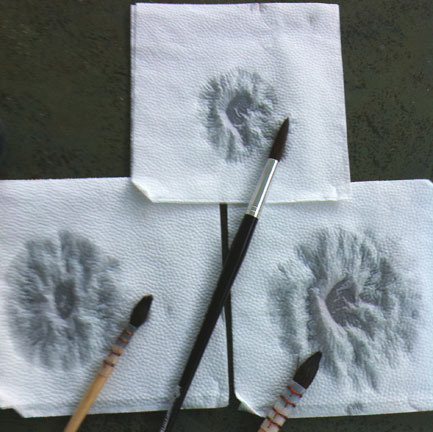 I then pulled each brush straight out of the water, allowed the water to stop dripping, then squeezed each brush over a napkin. The wet ring shows how much water each brush held. The synthetic brush (black handle, above, top) sheds water as you pull it out of the bottle. The smooth fibers don't hold water like the scale on the hair of the natural-bristle brushes. The natural brushes hold more water.