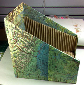 Covering the box with map pieces gives it a whole new lease on life. The color and the idea that the cards represent a new world of thought is a perfect connection.