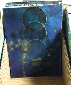 I love this card. It shows four circles of mica on dark blue and gold monsoon papers. It represents time changes as shown in the phases of the moon–as the shadow of the earth changes its shape. The back of the card says, "Our shadow changes the shape of the moon from a sliver crescent to a disk of light floating through the stars. It is not the moon that changes; it is our perspective of the moon."