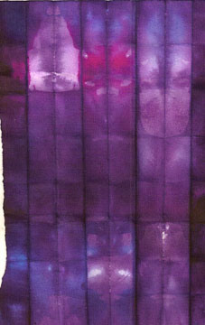 The wet paper was far more satisfying. The color soaked in enthusiastically and spread, so the only spot of white was the markings of the clamp. Having answered the basic question, I then decided to put the paper through tougher tests. I crumpled a piece and dipped various angles in different dyes. The paper creases absorbed more paper and gave a much more interesting color and texture for a book artist.