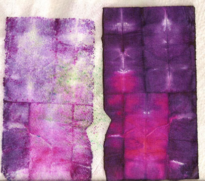 The first experiment we tried was wet v. dry. I did a fan fold and Roz did a triangle fold. Arches Text Wove is finished with a slight gelatin wash, which was easy enough for the fabric dye to penetrate. However, the multiple folds of dry paper resisted the inks, as they should have.