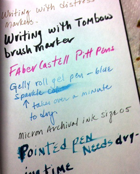 I tried a big variety of writing instruments, and not a single one showed through. What did surprise me is that some of the pens–gelly roll and pointed pen dip nibs and bottled ink–took a long time to dry. In Phoenix, I generally don’t have that problem. But both the inks that smeared–gel pen and dip pen can take a bit to dry, so that’s fine. So far, so good.