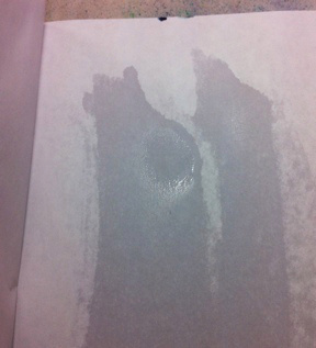 The wet paper turned gray. Not just a little, but considerably. The paper buckled and water pooled. The green tint is not on the paper, it’s my camera. The gray, however, is all the paper. I pressed on, and created a wash of blue and purple.