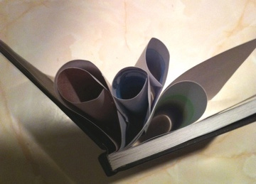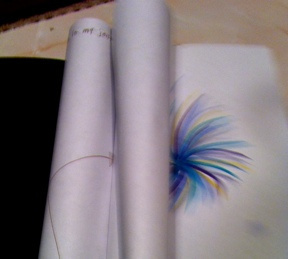 Those are pages of the journal, drying. Of course, when they roll up, they smear the color, which is not yet dry. The flat page with the starburst of color was done with Copic markers. That page did not bleed through, nor did it curl.