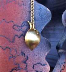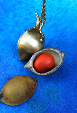 An Ironwood tree seed pod in gold. Seed pods often come in multiples, and when dry, make a subtle rattling sound when shaken. The seed inside is red.