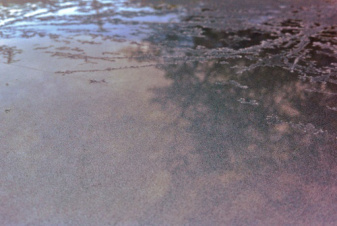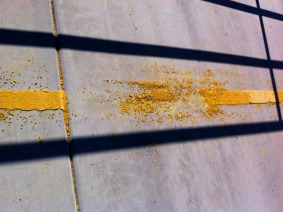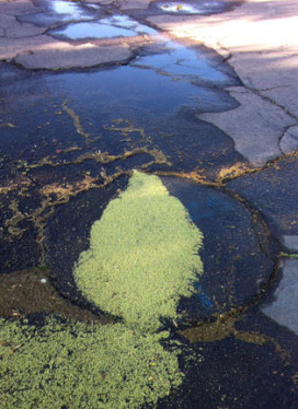 Pollen dust form a leaf shape as it gathers in sprinkler run-off.