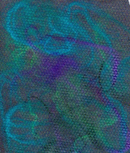 First, a black interfacing sandwich. Bottom: Black interfacing, sticky side up. Middle: Green, purple and a bit of white roving. Top: blue nylon net. I wanted to add the net because if the glue from the interfacing wasn’t enough to hold all the roving, the nylon net would contain it. The fiber is so light it floats from surfaces. And I liked the texture from the last experiment.