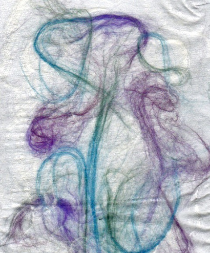 After the disappointing soy-silk roving experiment (that included fabric medium and a disappointing, plasticky result), I decided to keep experimenting. Art-instigator Rosaland Hannibal contributed white soy-silk roving and expertise on the topic I wanted to experiment with–fusible webbing and interfacing. The results are much more satisfying.