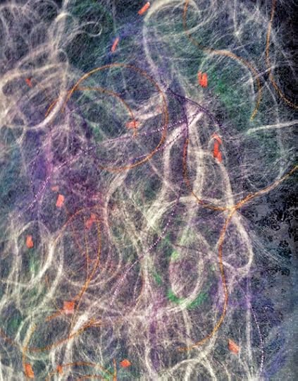 Third, Misty-Fuse sandwich. Bottom: White Misty-Fuse. Middle: white soy roving, green roving, purple roving, orange thread clippings, copper fabric clippings. It was photographed on black paper.