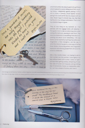 who is open and clear about her detailed 2D and 3D work as well as her disability; a detailed article about blogger Tammy Garcia (DaisyYellow) and her irrepressible art ideas; a poem/journal about Coming Home by editor-in-chief Marit Barentsen that feels both familiar and far away.