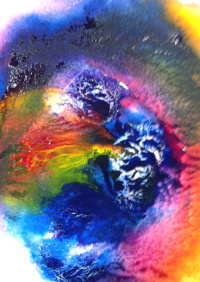 The second happy-maker was a beautiful woman who sat down and asked where the brushes were. “There aren’t any,” I explained, “This is done with ink and water and a voluntary surrender of control.” Seriously, she nodded followed the few directions, and created the most controlled uncontrolled piece I’d seen. Turquoise and black ink in wonderful proportions, delicate and powerful. Before I could ask to photograph it, she said, softly, “Is this art?” I answered, “Only you can decide, but it looks like it to me.” She smiled, took the card and vanished into the crowd.