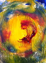 Then came the big reveal–peeling the two pieces of paper apart. His face was surprised, and a tiny smile crept across his face. I told him he could take them home and he checked with his mom. Once they were dry he picked up one in each hand. Later, as I crossed the hall, I saw him again, walking with his head down and his art clutched to his chest. It made my day. Art heals. Or at least, makes you happy.
