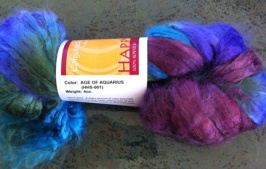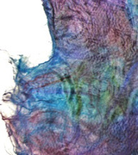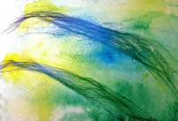 What else can this soft, lovely fiber do? I pulled off thin strands and draped them on a watercolored sheet that I had painted with glue. I like this interesting effect, although it is still very rough. I could see this method working really well on fabric with over-stitching.