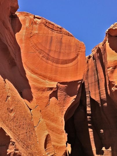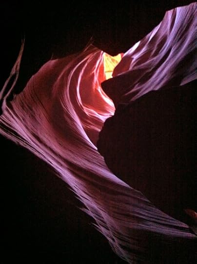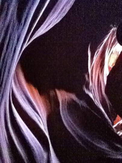 The instant you step into this space, everything you know about stone vanishes. This stone is many colors—violet and blue, pink and coral. The stone is worn down by wind and rain, starting millions of years ago. The carving continues to this day. When the Monsoon rains come, the water rises in a lake, then drops over the side and races down a dry river bed, tilts to one side, and curves into the slot canyon.