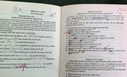 The top photo of the old grammar workbook shows something interesting. On the left side is a page marked “A” and on the right side is a page marked “C-” That’s a big difference. But it’s also very real. We do not travel at the same speed every day, we do not have the same impact. One day we are skilled and sharp, the next day slow and dragging. There are “A” days and “C-” days, but they are still our days. And with the inner critic, we keep up the dance between believing and overcoming, between accepting who we are, and working to move that C- to an A, and watch it tremble and slip and we push it up again. It’s not despair we feel, it’s determination to keep in balance.