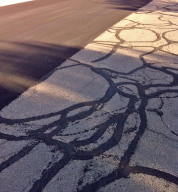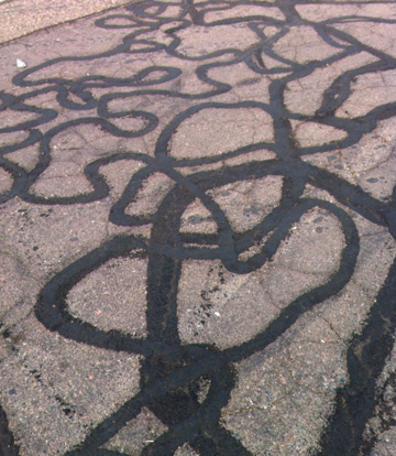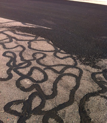 On my walk this morning, I saw the blinking light of a paving truck, out at 5:30a.m., re-surfacing the road. I watched the funny doodle-patterns get covered up. Seems that the doodle tar acts like glue to hold the surface in place.