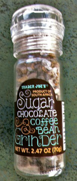 Trader Joe’s has interesting spices. I’ve found a quart of Mexican vanilla (fragrant and great for general cooking), smoked salt and paprika (a little smoke goes a long way), and now, a blend of sugar, chocolate and coffee beans. In a grinder jar. I could not resist.
