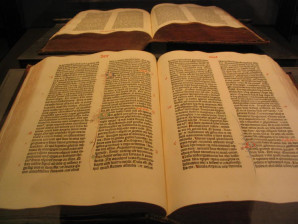 Gutenberg bibles in the Yale Rare Book Library. There are no windows in the library to prevent the breakdown of paper and parchment. Light comes in through marble slabs cut so thin they admit light, but no UV rays.