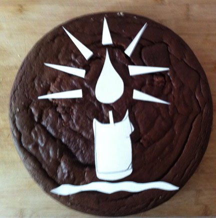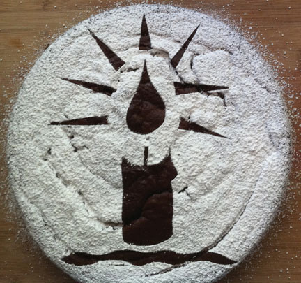 Once out of the oven, it looked dense, smelled great, and the chocolate won the color battle. The fabulous beet stencil from the original recipe was beyond my pay grade, so I settled for a celebratory candle and my trademark wavy line.