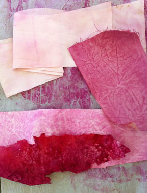Top to bottom is a cotton/poly blend of fabric–it took on a bit of color, but almost all of it rinsed out. Next is a piece of canvas that took the color well. Below that is a strip of Arches Text Wove (now called Velin). The fabric and paper were dried, and then the beet mash rinsed off. Before all the color came off, I heat set the pieces by ironing them. Beet color is fugitive, and without a mordant to hold the color, it won’t last. Over time, it will fade, but I find the reddish brown an acceptable color. The bottom strip is a very fragile paper that dissolved when I rinsed out the beets. To preserve this piece, I put the paper on a piece of parchment (still visible underneath all the papers) and sprayed it with a squirt bottle. It rinsed off some of the beet paste.