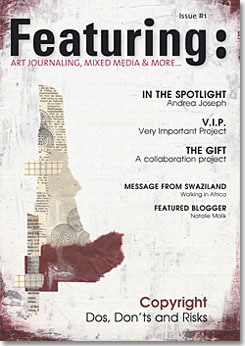 Featuring is a new magazine for art journaling and mixed media enthusiasts. It’s produced in Holland with an international contributor cast. Featuring uses an A4 size, (11.7 inches tall x 8.3 inches wide), which is taller and thinner than a sheet of copier paper. The layout is clean and crisp, a two-column design that makes the most of artwork.