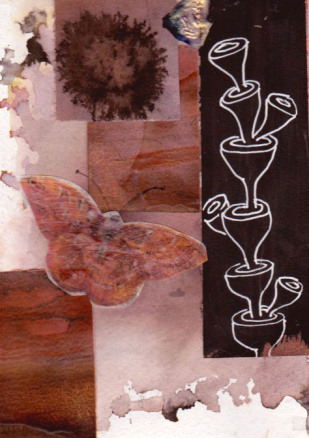 Collage using inked papers, gesso (black and clear) and gel transfer.