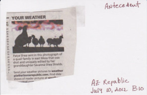 (In the example above, part of the story reads, ” . . . a quail family in east Mesa that was shot and uniquely edited by her granddaughter. . .” On the front of the card, I put the source, date, page, and section of the paper so I know where it came from. When I need it, I scan the newspaper piece and can use it in class.