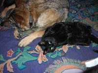 The other major physical change we have noticed is a deterioration in Tajji’s hearing. As far as we can tell, her vision is still quite good, but she no longer responds instantly to someone knocking at the door or being called from across the house. Commands spoken in a soft voice must often be repeated more loudly. Fortunately, we began teaching her hand signals as soon as she came to live with us, and we have been relying on those more and on verbal commands less. She seems quite content with the shift.