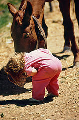 We tend to think about riders trusting their horses and forget that this is a partnership. Skilled horse people understand that the horse must trust its rider as well. Once we stop thinking about horses as animate transportation machines or ego-appendages but sensitive, responsive creatures whose intelligence is different from ours but nonetheless exists, we open the door to a relationship of mutual respect. "Training" should not mean "instilling automatic responses through discipline." Perhaps we need a different term to get away from the old association. Training is establishing a relationship in which communication becomes clear and trust is established. It's learning to "talk horse" and "listen horse."