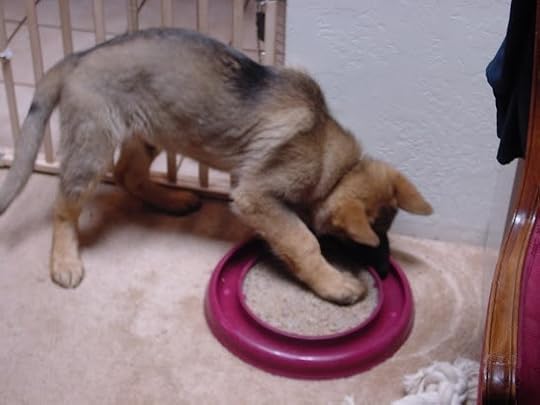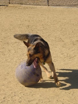 Herding his hard rubber horse ball. He would do this for hours, bringing the ball back so we could roll it away for him and barking at it to let it know who was boss. We tend to forget that German Shepherd Dogs are indeed sheepherding dogs. This is his spherical "sheep."