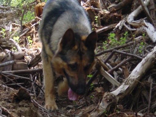 About 1 year old, hiking in our area. He would have made a super search-and-rescue dog, he was so focused on scent. You can see how he's "tracking" naturally.