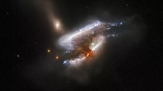 A spectacular trio of merging galaxies in the constellation Boötes takes center stage in this image from the NASA/ESA Hubble Space Telescope. These three galaxies are set on a collision course and will eventually merge into a single larger galaxy, distorting one another’s spiral structure through mutual gravitational interaction in the process. An unrelated foreground galaxy appears to float serenely near this scene, and the smudged shapes of much more distant galaxies are visible in the background. Image Credit: ESA/Hubble & NASA, M. Sun. Article here.