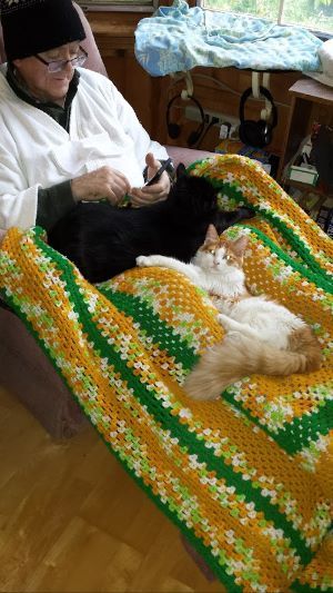 Here are Shakir and Sonja, curled up with my husband on a chilly morning. Shakir is about twice Sonja's size, but that does not stop her from inserting herself into wherever she wishes to be. She's been known to curl up on top (literally, not beside but on top) of him. He is totally indulgent with her. Considering that when she was first introduced to him as a kitten, she threw herself on her back and screamed, and is now bossing him around mercilessly, we consider this great progress. Snippet from Arilinn