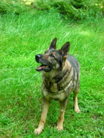 Tajji, our elderly German Shepherd Dog, came to live with us a little over a year ago when she retired from seeing eye guide dog work. She learned new behaviors in the process of “being just a dog.” Her behavior also showed us some of the many things dogs who help the blind must learn. Some of these are responses to commands. Tajji knows “Go Right,” “Go Left,” “Easy (slow down),” and “Back,” for instance. She was also able to enter a mall (a chaotic place for a dog) with her blind person and, never having been in this place before, guide him to an elevator, escalator, or rest room.