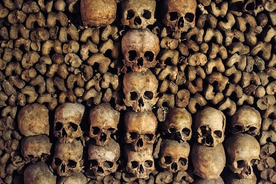 Dating from the first century C.E., folks have mined limestone under what would become Paris. So extensive were the underground tunnels that in 1774, there was severe collapse (300 meters) at Rue Denfert-Rochereau and thereafter no more mining was permitted. But Paris had another problem: overfilling graveyard. So in 1786 the municipal ossuary known as the “Catacombs” was consecrated, and the following decades saw the transfer of bones from the parochial cemeteries of Paris. Eventually, the bones were rearranged in chamber after chamber, largely due to the efforts of Louis-Étienne Héricart de Thury, director of the Paris Mine Inspection Service. Some of the resulting designs were downright macabre, others whimsical, all of them shiver-producing. What the histories don’t tell is how the temperature falls as you descend the staircase at the Denfert-Rochereau entrance, or how the bones in the outer chambers are slightly green. Or the charcoal guidelines on the ceilings… Or the whispers that must surely be due to your imagination…