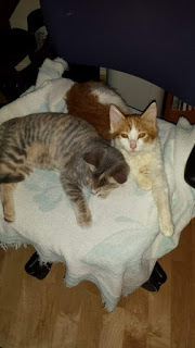 The red and white (with golden eyes) possible Maine Coon mix is (Red) Sonja. She's 6 weeks older but had a really rough start in life, so is slower to catch up. They're both about 4 1/2 lbs now.