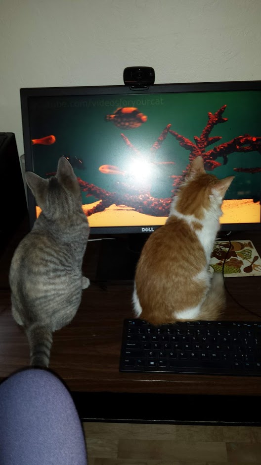 Some days, we all just need a few kitten endorphins to get through the day. Our two hang out in my office. Freya, on the left, is 6 weeks younger than Sonja, on the right. They're the same weight, although Sonja is rangier. Sonja had a particularly rough start in life, so she may be slower in her growth. Poor sweetie was so thin when we got her, you could feel all her ribs and her spine. Now she's on her way to being a butterball. Both of them love watching the fishies in these videos.